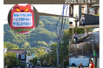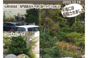 10月16日(木)の朝、円山西町3丁目において、今年に入って3回目となるヒグマの出没情報がありました。今回は子供たちが通学する時間帯であり、また町内会役員有志による「見守り活動」実施中のできごとでした。幸い、けが人はなく・・・