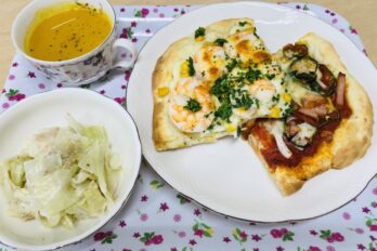 今月は、旬のかぼちゃを使ったスープ・簡単サラダ・ピザ2種類のメニューをご紹介します。 【和風かぼちゃスープ】4人分 かぼちゃ 1/4個(300g~350g) 玉ねぎ(中) 1/2個(薄切り) だし汁 6・・・