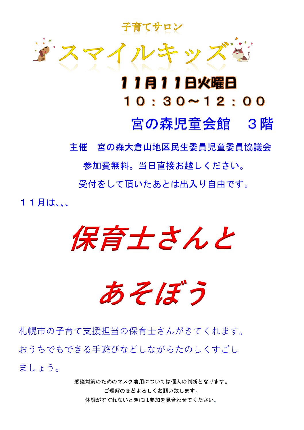 11月の子育てサロン(スマイルキッズ)のお知らせです。 宮の森児童会館で10時30分から開催されます。 お子さま連れの方なら、どなたでも参加できます。 本格的な冬を迎える前に遊びに来てみませんか?