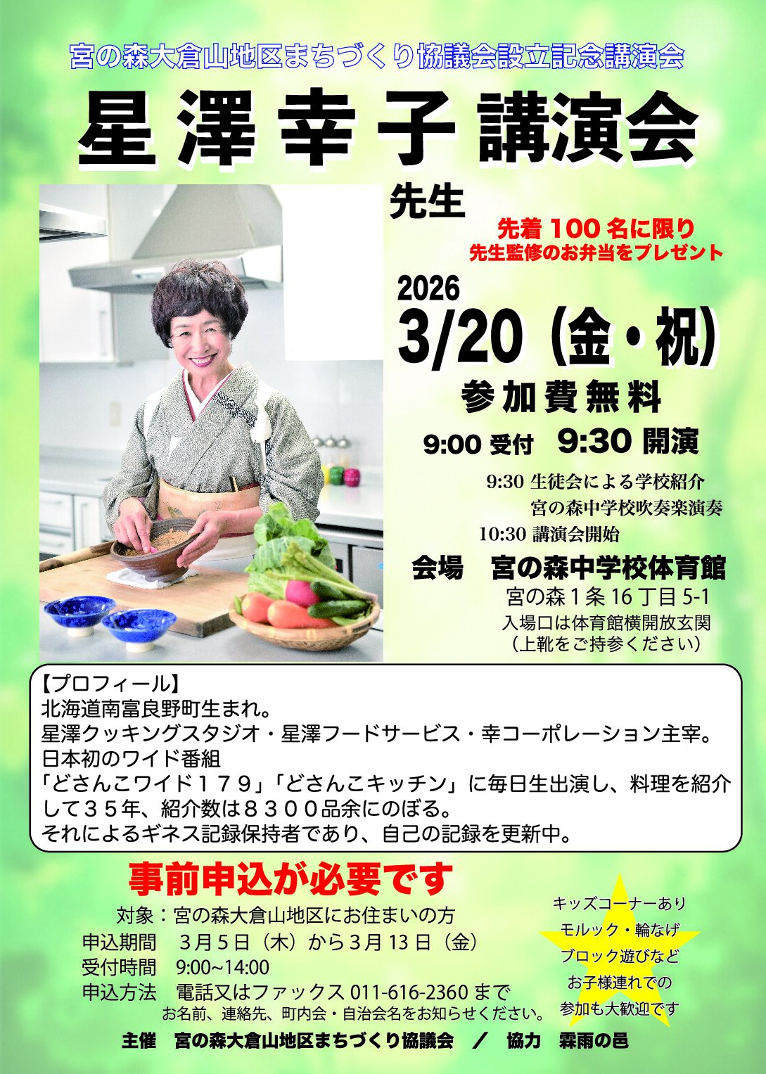 「どさんこワイド179」のお料理コーナーでお馴染みの星澤幸子先生の講演会を開催します。 講演会テーマ:「美味しい食卓作り 人創り」 期日: 3月20日(金・祝) 9:00 受付開始/9:30 開演 会場: 宮の森中学校 ・・・