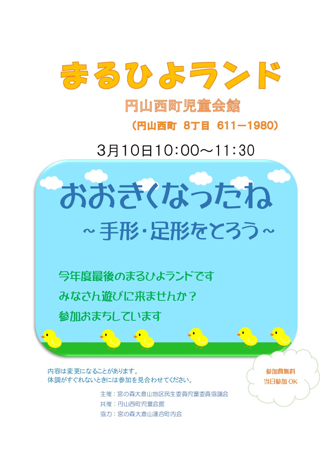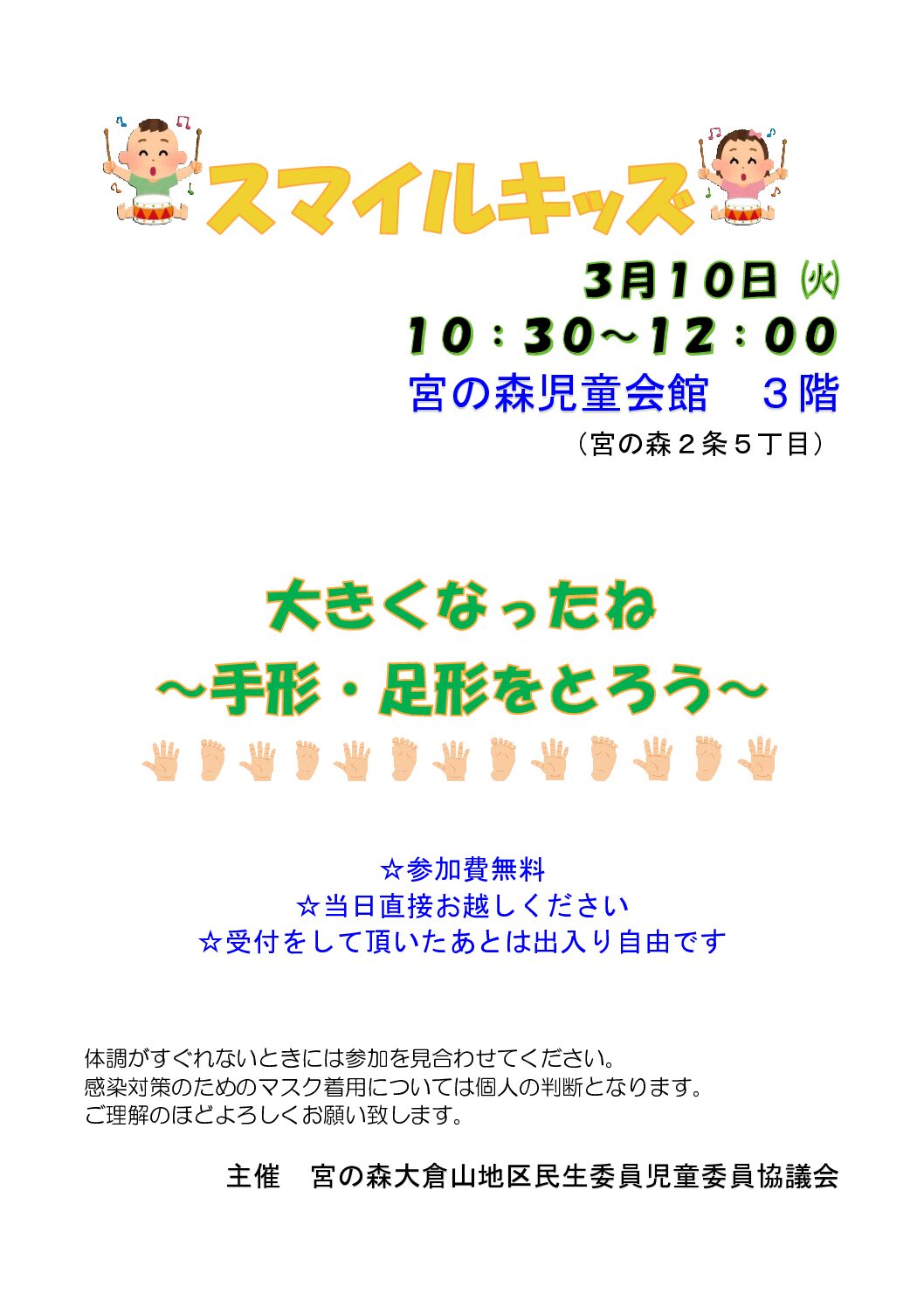 3月の子育てサロンのお知らせです。 宮の森大倉山地区民生委員児童委員協議会では月に一度円山西町児童会館にて 地域の子育てサロン「まるひよランド」を主催しています。 今月は「大きくなったね~手形足形をとろう」です。 小さな・・・