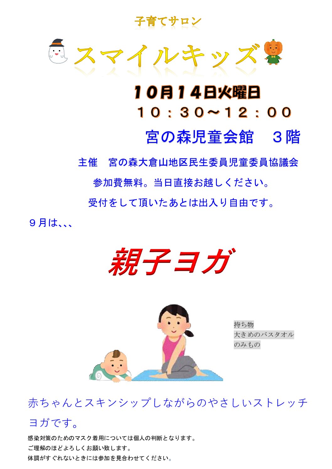 10月の子育てサロン(スマイルキッズ)のお知らせです。 宮の森児童会館で10時30分から開催されます。 お子さま連れの方なら、どなたでも参加できます。 今月は親子ヨガです。お楽しみに!!