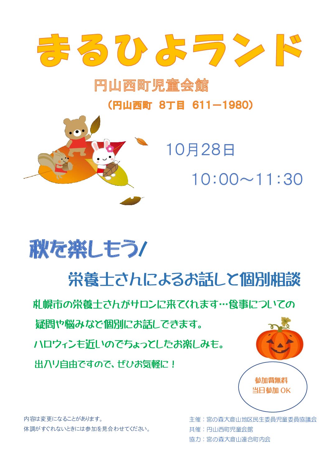 10月の子育てサロン(まるひよランド)のお知らせです。 円山西町児童会館で10時から開催されます。 お子さま連れの方なら、どなたでも参加できます。 今月は、栄養士さんによる個別相談を開催します。