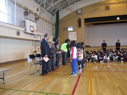 ■平成24年3月1日(木)8時45分から、三角山小学校の「3月の全校朝会」にて日頃から子どもたちを見守っている地域の方々に感謝状が贈呈されました。 ■この日は、交通指導員の西塚さん、児玉さん、柿本さん、阿部さん、スクール・・・