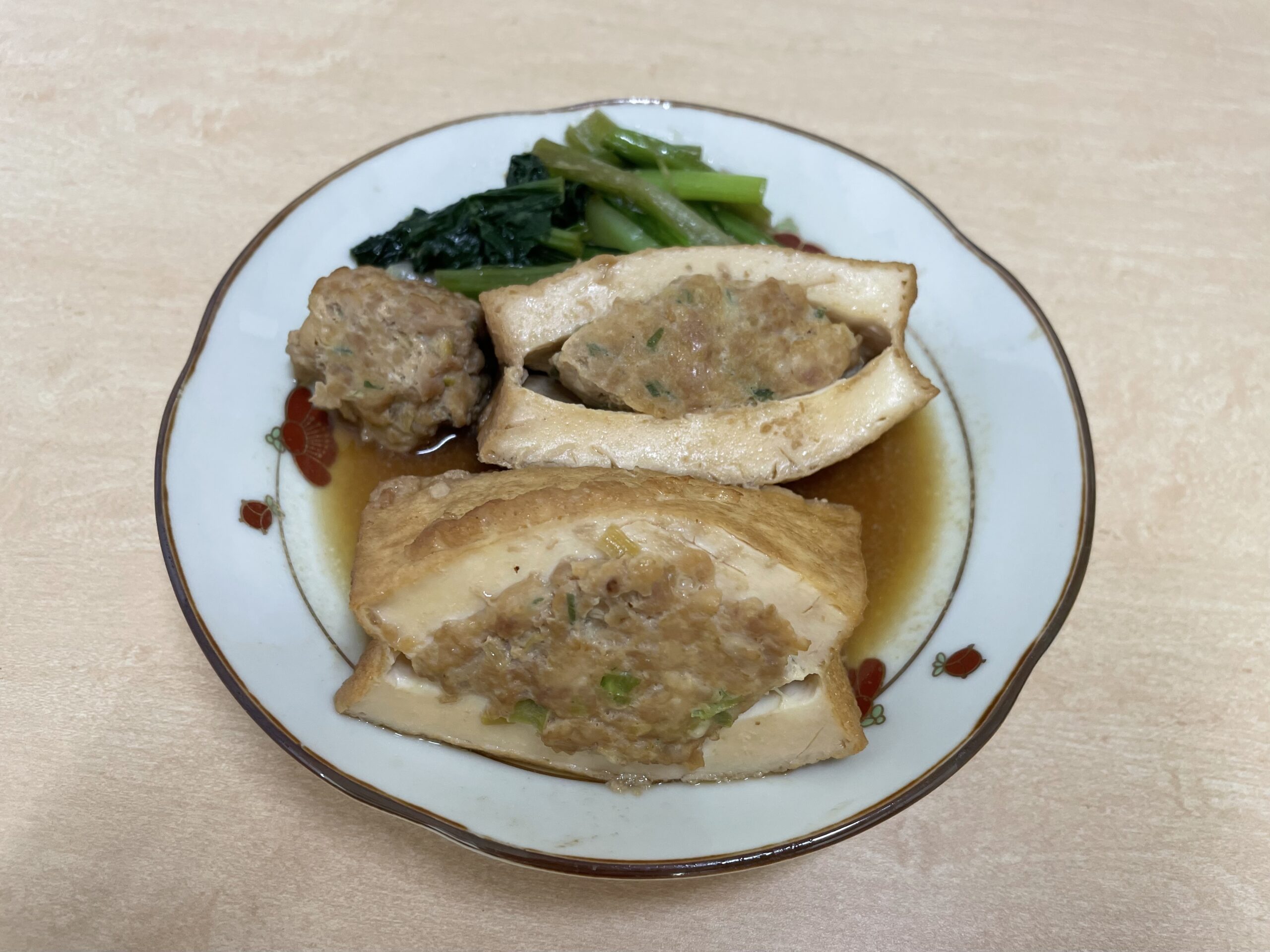 ② 厚揚げは、1枚を斜め半分に切り、三角形にする。切り口から切り込みを入れ袋状にする