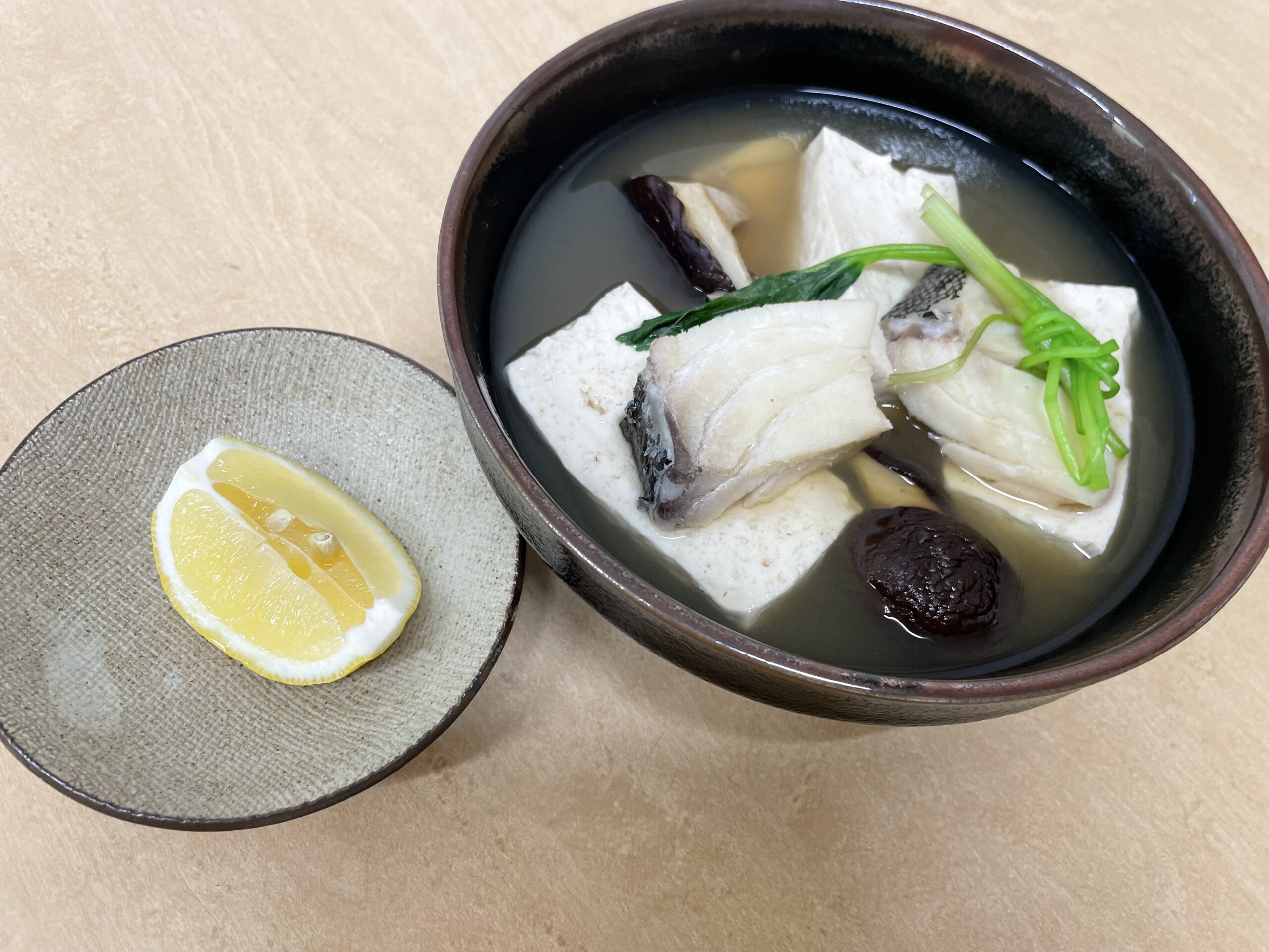 ③ 豆腐は8等分に切り、すだちは半分に切る。みつばは、サッと茹でてから2本ずつ結ぶ