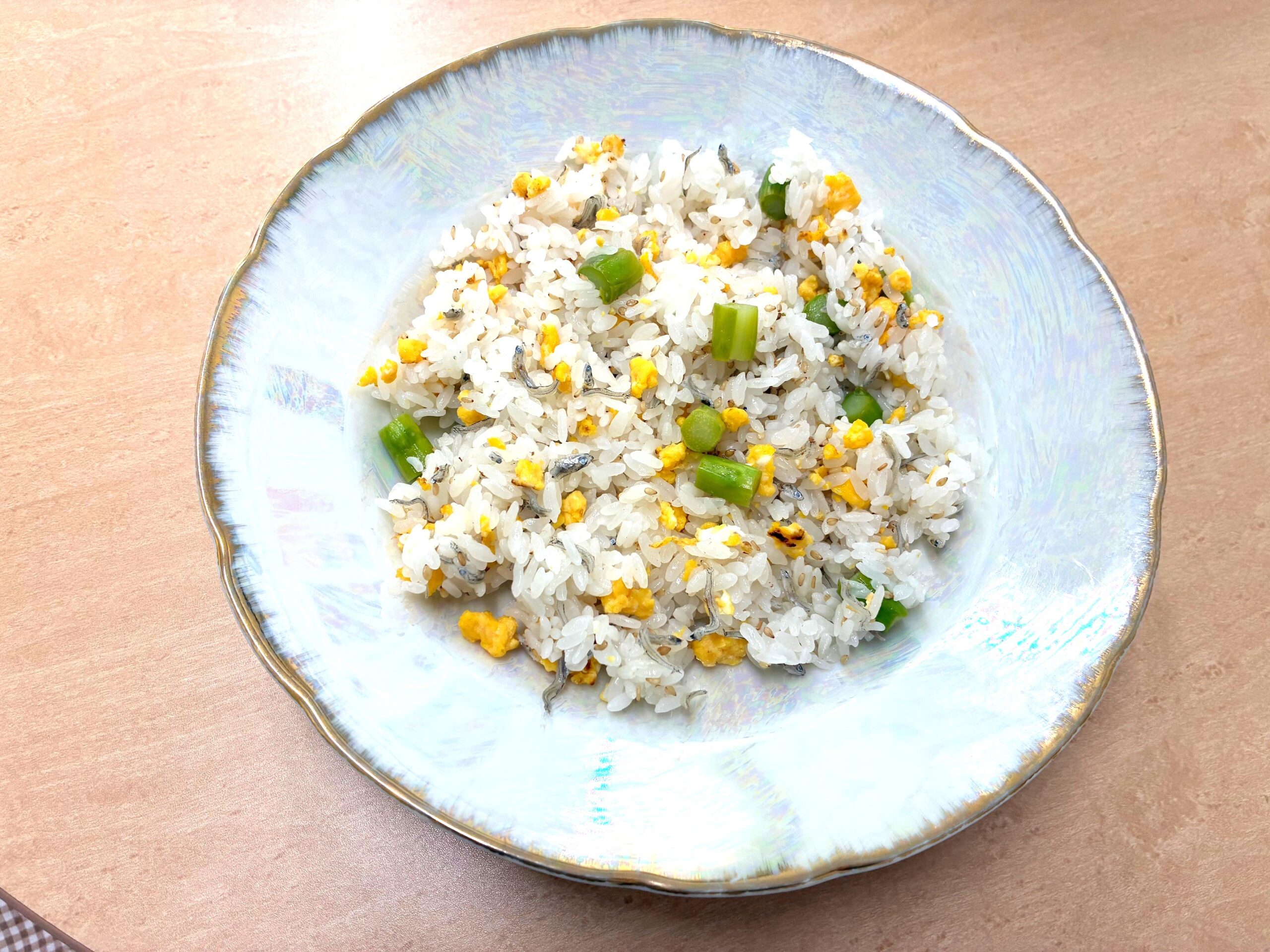 ⑤ ご飯に④をかけて、アスパラガス、炒り卵、白ごまをつぶさないようにさっくり混ぜる