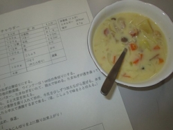 最後に、食改さんが作った野菜たっぷりのチャウダーと赤じそのジュースを参加者60名でおいしくいただきました。