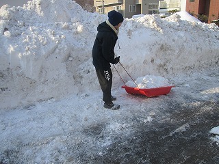 取り除いた雪はそりに載せ、坂道を上りながら引っ張って運びました。