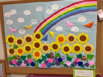 「元気に遊びましょう」「笑顔を忘れず」などとメッセージを添えて、児童会館の階段2階踊り場に