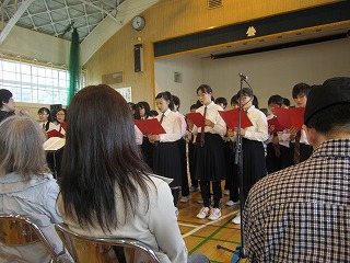 次は部員が合唱して曲を2曲披露してくれました。2曲目には、会場に来ていた宮の森中学校の生徒も飛び入りで参加。