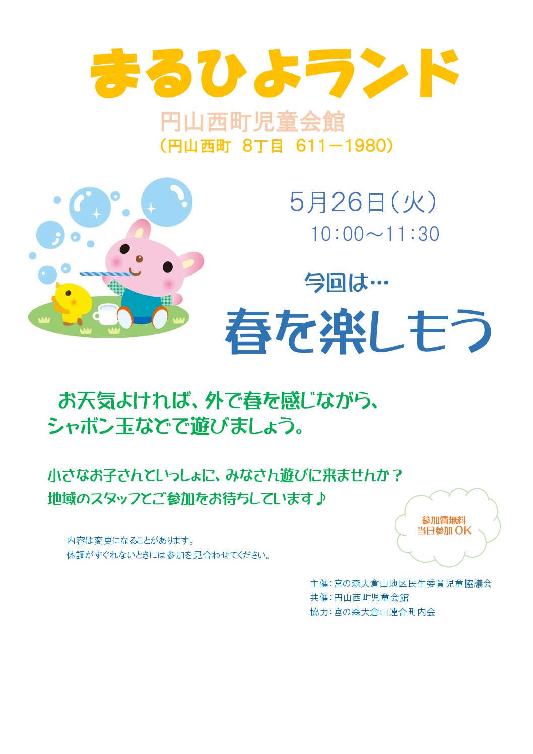5月の子育てサロンのお知らせです。 宮の森大倉山地区民生委員児童委員協議会では月に1度円山西町児童会館にて地域の子育てサロン「まるひよランド」を主催しています。 今月は「春を楽しもう」です。お天気が良ければ、外でシャボン・・・
