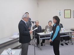 ■この日は、精勤された57名の生徒さんに終了証書が、また、押し花教室で指導にあたったプロジェクトの10名に感謝状が、吉田会長から手渡されました。