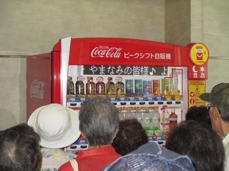 自動販売機には「やまなみの皆様 ♪ ようこそ」のメッセージが表示され、製造、保管、出荷の工程を見学し、全員で、おいしく冷えたコカ・コーラ製品で乾杯しました!
