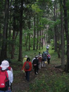 ■この日はあいにくの雨模様でしたが、参加者約90名は元気に出発。赤く色づき始めた木々を楽しみながら、荒井山を越え大倉山ジャンプ競技場に到着しました。