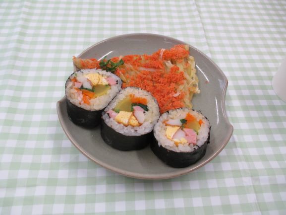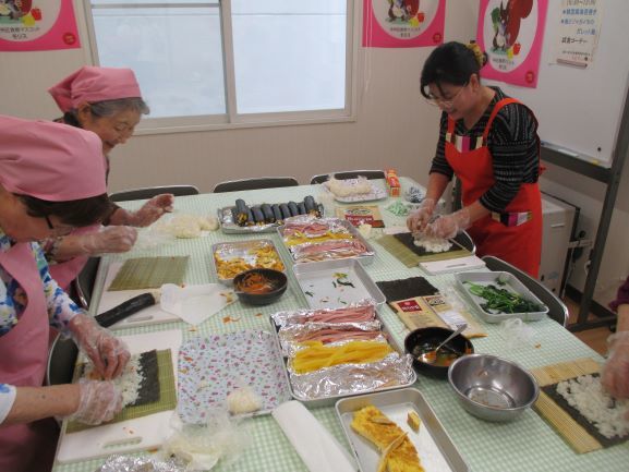 1日目(5日)には、「食と健康まつり」も同時に開催され、食生活改善推進員さんによる「韓国風海苔巻きと手作りおやつの試食会」では、韓国領事館のヒョン・ミョンスクさんの指導による本場韓国の海苔巻き(キンパ)と鮭とジャガイモのガレットが提供されました。食べた方からは「本場の海苔巻きはおいしいね」「具は何が入っているの」との声が聞かれ、レシピを渡しながら説明していました。