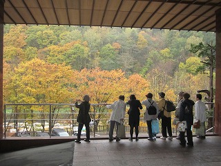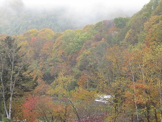 ホテルの前の山々の木々は、色づいており、ホテルの窓から見る景色はきれいです。