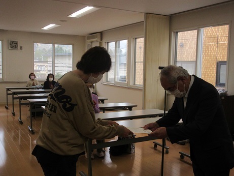 修了式はコロナ対策のため2回に分けて開催することとし、本日は14名に修了証書を授与しました