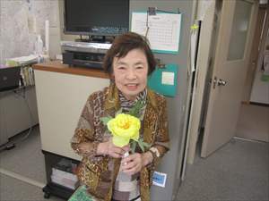 話は変わって、今日、連合町内会女性部副部長の堀川さんが見事な牡丹の花を一輪持ってきてくださいました。自宅のお庭に咲いたもので、黄色い牡丹は珍しいそうです。良い香りがしますよ~。花の命は短くて3日ほど。会館の入り口に飾っていますので、お越しの際はぜひご覧になってください(^^)/