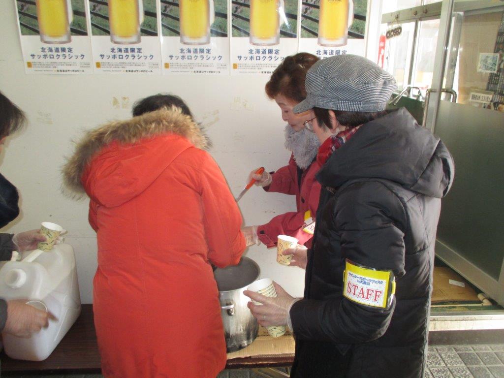 その中で、連合町内会の役員や女性部が中心となり、あたたかいスープの無料配布を行いました。一時は長い行列ができるほどで、800食用意したスープは、2時間ほどでなくなりました。