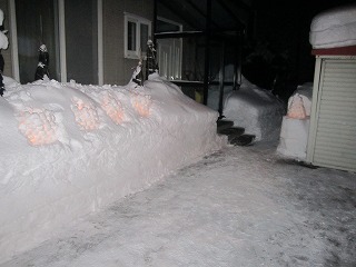 中でも目を引いたのは、雪の壁に穴を開けて幾つものキャンドルを並べて点灯し、家の前を温かい光で包んでいるもの、「祝雪まつり」という看板を掲げて雪の穴の中に点灯したキャンドルを並べたもの、これらです。