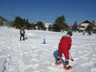 ゴルポッカは、北翔大学の研究グループが開発した冬の新しいスポーツで、いわば雪上パークゴルフ。北翔大学の小田教授、同前教授である加藤満先生のご協力により、ボール、クラブ、カンジキを大学からお借りして実施しました。