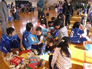 ◆様々な遊びのコーナーでは、区役所の職員のほかに、民生・児童委員、専門学校、旭が丘高校、向陵中の生徒、児童会館を使っている児童が、幼児の相手をしていました。