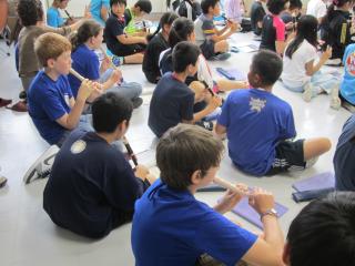 ◆6月21日(木)午後、5年生の児童と一緒に、音楽の授業を受けました。音楽室で一緒に教科書を見ながら、滝廉太郎作曲の「花」を歌いました。また、星笛という曲も一緒にリコーダーを演奏し、宮小とリッチモンド小のアンサンブルができました。日本の小学校では、音符を見ながら演奏するのに対し、ポートランドからの小学生の話によると笛の指使いは、1、2など数字で示すそうです。また、リッチモンド小では音楽の授業が行われていないそうです。授業の最後に宮の森小の5年生が校歌を歌いました。きっと両校の児童にとって、思い出に残ることでしょう。