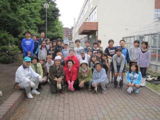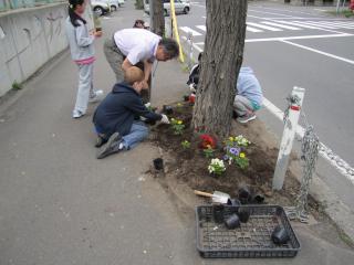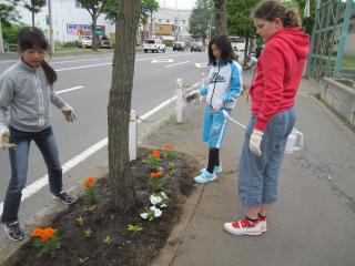 ◆音楽の授業が終わったら、学校の脇を通る歩道の花壇に花の苗を植えました。花の苗植えには北二町内会の方々がご協力していただきました。子どもたちは地域の方々と一緒に、花の色や苗を植える位置を考えながら、一生懸命に植えていました。宮の森小の5年生と北二町内会の方々が協力して苗を植えるだけでも大変素晴らしいことなのに、リッチモンド小の4名も加わって花の苗を植えるのは、画期的な出来事であり、夢のような交流であります。このような交流の輪が更に広がっていくことが期待されます。