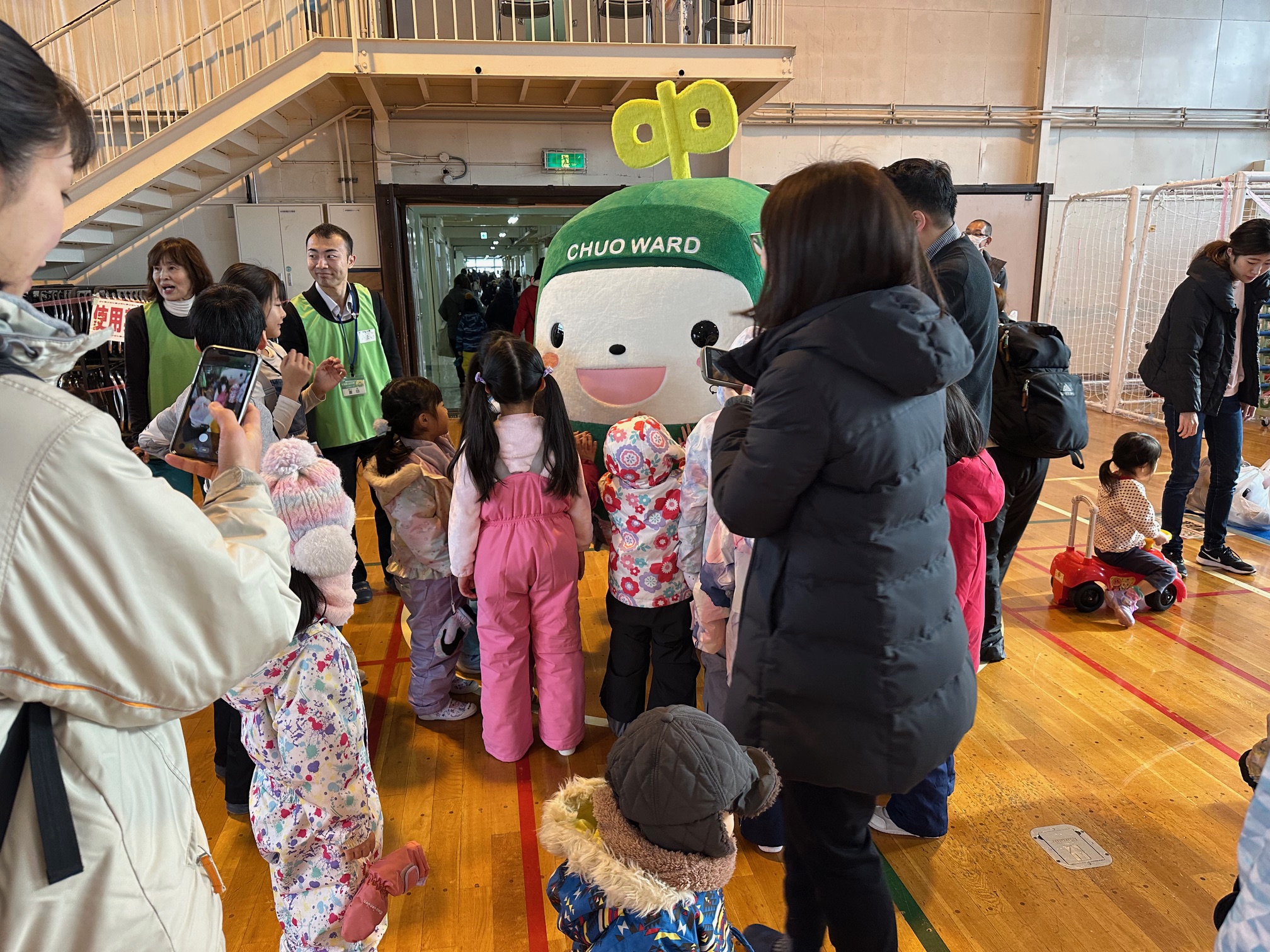 イベントの途中には、中央区のマスコットキャラクター「中ウォークん」が登場し、子どもたちと触れ合いながら会場を盛り上げました。突然の登場に歓声が上がり、写真撮影や握手を楽しむ姿があちこちで見られました。