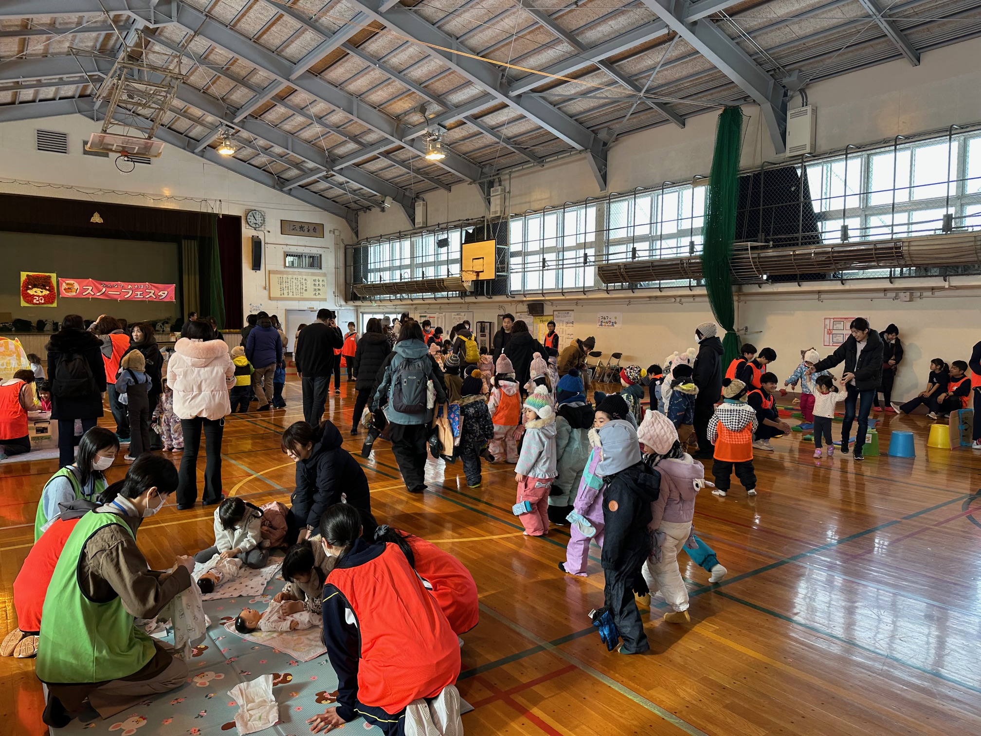 体育館では、ボウリングやゴルフ、折り紙などの室内遊びも用意され、寒さを忘れて夢中になって遊ぶ子どもたちで大いに賑わいました。