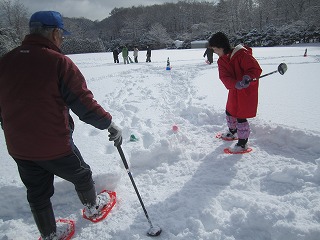 雪面にソフトボール大の軽いボールを置き、ゴルフのようにクラブで打ち、コースの目印として置くコーンに当てるまでの打数を競うものです。