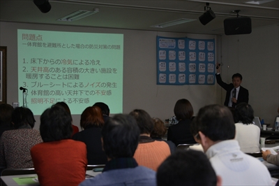 この日は、根本昌弘(ねもと・まさひろ)日本赤十字北海道看護大学准教授による講演「積雪寒冷地対応型の避難所運営を自助・共助から考える」から始まりました。北見市内において、厳冬期に避難所設営演習を行い、何度も体育館で宿泊を行ってきた経験をもとに、低温下の体育館で生活する上での問題点や対策などが、豊富な実例とともに紹介されました。「住む場所だけ提供しても、「いのちを守る避難所」にはなりません。「衣・食・住」に加えて、「情」、安否確認などの「情報」ともうひとつの「情」、助け合う「こころ」が必要です」との言葉に参加者らは深くうなずいていました。