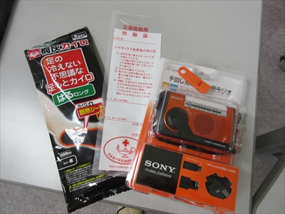 根本先生おすすめの避難所グッズ。左から、足裏に貼るカイロ・炊飯袋・ラジオ。SONY製の手回しラジオはハンドルが軽快で、携帯電話も充電できるすぐれものだそう。このほか「着る毛布」が寒さ対策に有効だとか。