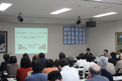 続いて行われた講演「みみを澄ませ、小さな心によりそう支援~東日本大震災と東京電力福島原発事故にみる札幌市民の災害支援活動について~」では、三上めぐみ(みかみ・めぐみ)NPO法人みみをすますプロジェクト代表が、東日本大震災発生直後に被災者救済のために立ち上げられた「東日本大震災市民支援ネットワーク・札幌(通称むすびば)」の活動について、札幌で発足した初期の経緯や、震災による避難者自身も活動に加わっていった中期以降の動きについて詳しく紹介してくださいました。