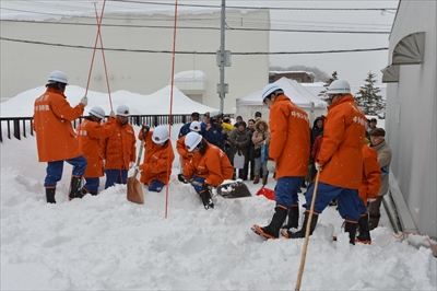 その後、場所を宮の森消防出張所(札幌市中央区宮の森2条11丁目)敷地に移し、落雪による雪山からの救出訓練と煙道通過体験が行われました。