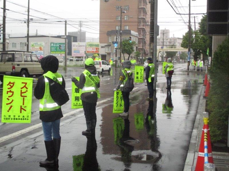 小雨が降るあいにくの天気のなか、宮の森大倉山地区交通安全母の会、交通安全運動実践会、交通安全指導員のほか、宮の森小学校のPTA、校長・教頭先生、中央区役所、西警察署からも駆けつけ、総勢63名が参加しました。