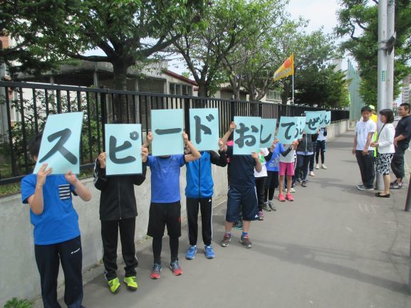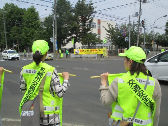 山の手通と宮の森北24条通が交差するこの場所は交通量が多く、参加者は「スピードダウン!」「シートベルト着用」「とまって よくみて みぎ・ひだり」と書かれた旗を持って、また、児童は「スピードおとしてあんぜんうんてん」と書かれた手作りのボードを掲げて、ドライバーに向かって交通安全を呼びかけました。