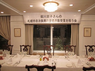この受賞により、宮の森大倉山連合町内会会長を代表とする発起人4人が「堀川京子さんの札幌市自治振興功労者表彰受賞を祝う会」を企画し、平成25年11月25日月曜日夕刻に祝賀会を開催しました。