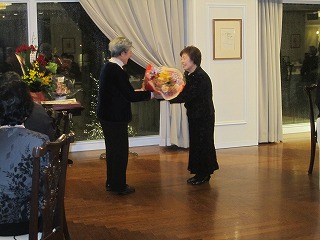 ご来賓祝辞に続いて、宮の森中央町内会会長の松田健一郎さんから堀川京子さんへ、記念品が贈呈されました。