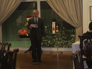宴もたけなわとなったところで、宮の森大倉山連合町内会相談役の東健治さんにご登場いただき、乾杯のご発声をしていただきました。