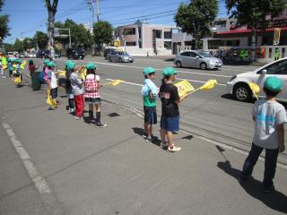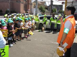 ◆この日は、夏の交通安全運動の初日。今回の街頭啓発には、ご来賓として、中央区役所の森下総務企画課長、吉田連合町内会長、各小学校の校長先生などをお迎えしました。三角山小学校の三年生55名も街頭啓発に参加し、小さな旗を掲げて運転手にスピードダウンとシートベルトの着用を呼びかけました。子どもたちの活動に多くの運転手も注目し、安全運転に努めていました。