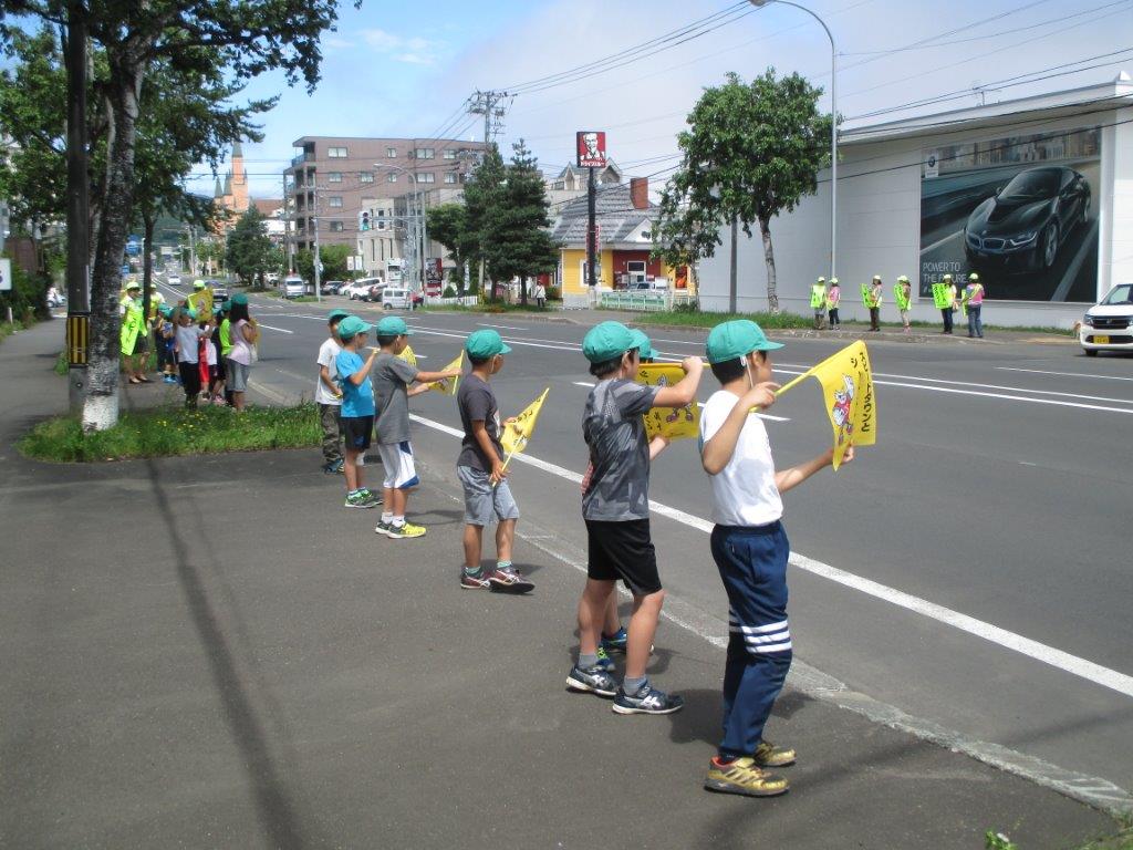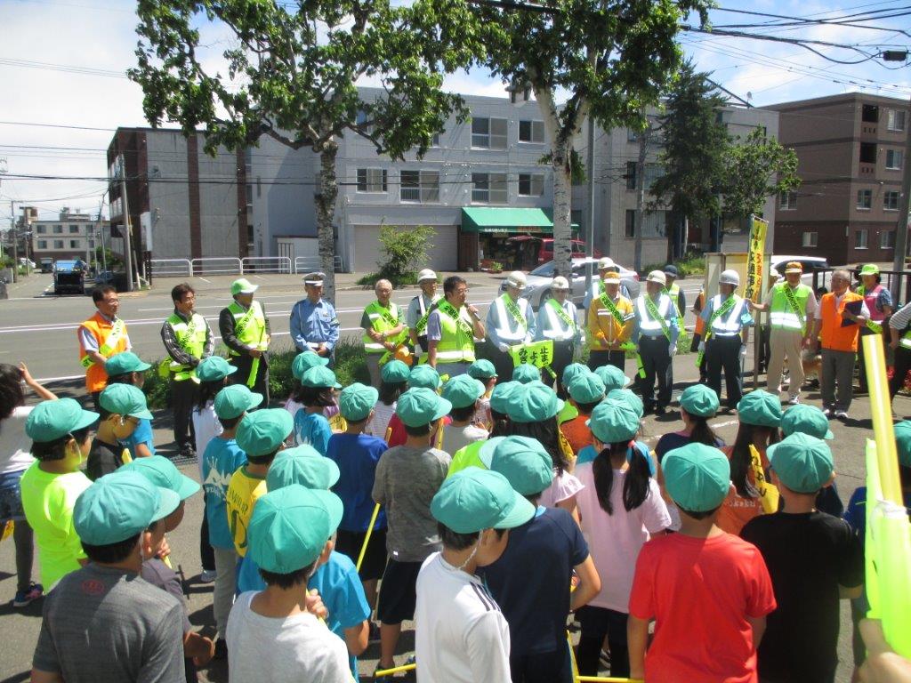 明け方までの雨がうそのような晴天のもと、三角山小学校3年生41名と宮の森大倉山地区交通安全母の会、交通安全運動実践会、交通安全指導員のほか、三角山小学校をはじめとしたPTAのみなさん、各学校の校長・教頭先生、中央区役所、西警察署からも駆けつけ、総勢114名が参加しました。