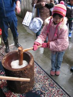 ■小雪の舞う気温の低い日でしたが、時間前から餅つきの順番待ちには長蛇の列ができ、次々と蒸し上がってくるお米を3台の臼でついていきました。また、室内では、みんな粉だらけになりながらも、つき上がってきたお餅を食べやすいサイズに丸めていきます。