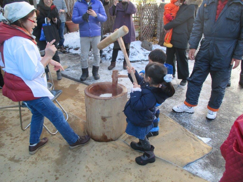 臼と杵を使ったお餅つきを初めて見る子どもも多く、大人の指導を受けながら、お餅つきを体験。また、お父さんもお餅つきに参加。子どもとは違う餅つきの音に、子どもたちからは「すご~い」と歓声が上がっていました。お父さんたちは筋肉痛になっているかもしれませんね。