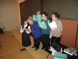 ③続いて、歌の会の方々が登場。テープの演奏や中山さんのハーモニカ演奏に合わせて、一月一日、富士山、草津節(草津の地名を札幌に替えて)などを皆で歌いました。