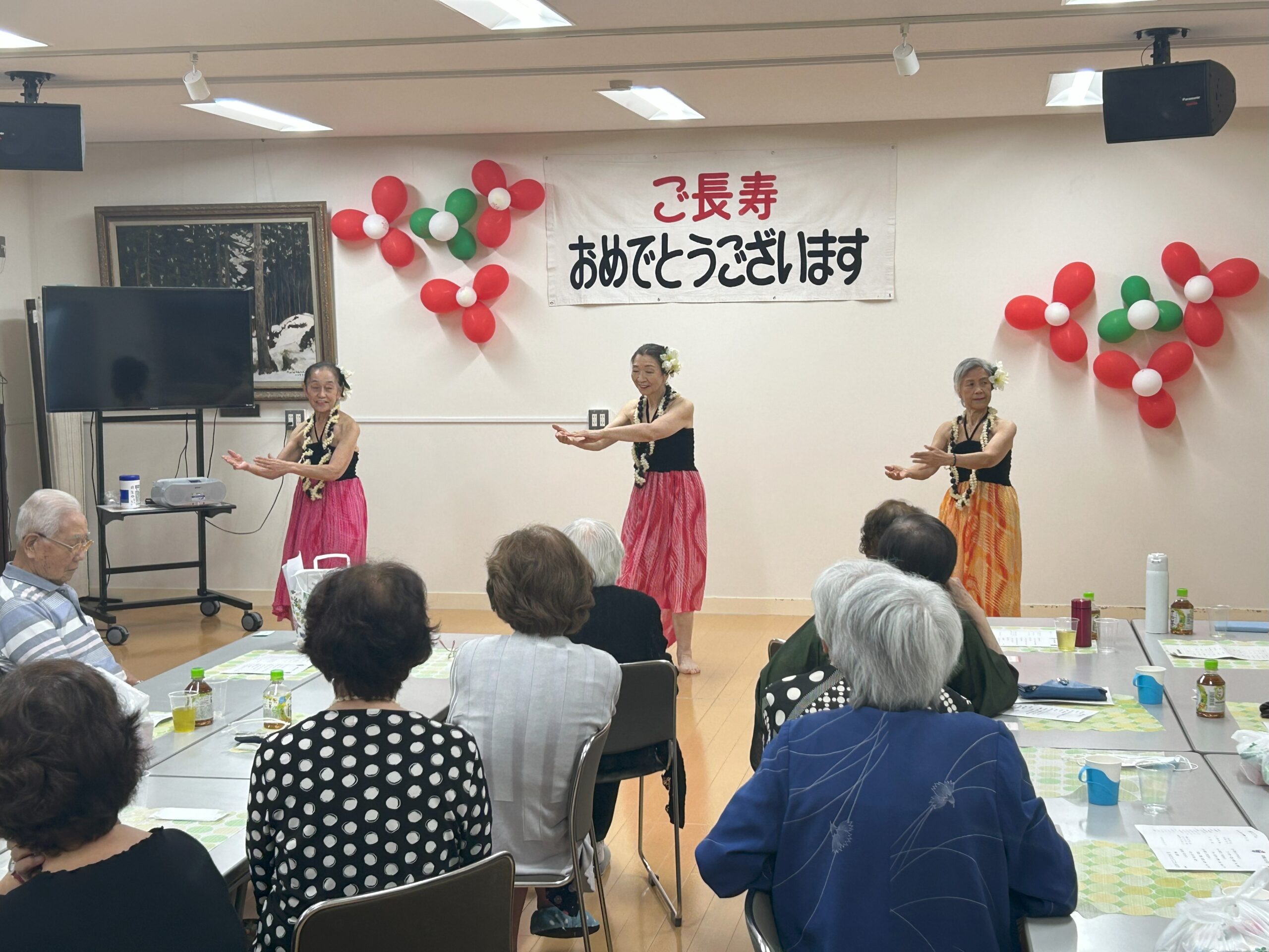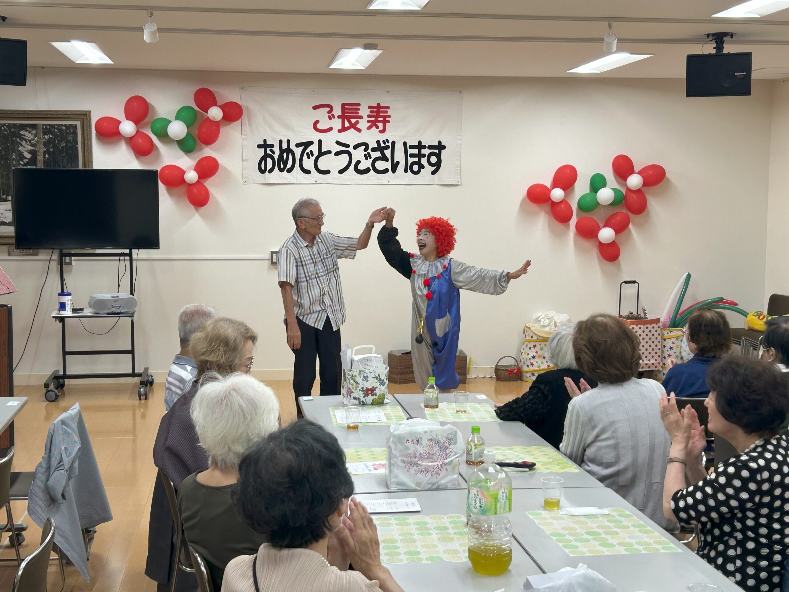 続いて、米寿を迎えられた田川さんの乾杯のご発声により懇親会が始まりました。懇親会では、余興としてピエロショーやオカリナ、フラダンス、カラオケなどが披露され、会場は大いに盛り上がっていました。