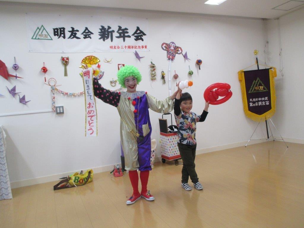 この日は御祝儀舞が披露され、祝杯の後、皆さんで会食。余興では「かりゆしケアーズ」による沖縄三線と歌が披露されました。舞踊、ピエロショー・風船アートと続いた後、民謡、コーラス隊による発表。最後は会場全員で「北国の春」「学生時代」を歌いました。