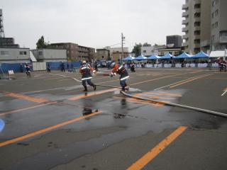 ◆平成24年7月4日(水)午後2時、JRA札幌競馬場の東駐車場において、「平成24年度札幌市中央消防団消防総合訓練大会」が行われました。この大会は、区内の消防団が消防技術の向上を図るため、毎年行っているものです。中央区には1本部13分団の消防団が置かれ、団員数は251名です。
