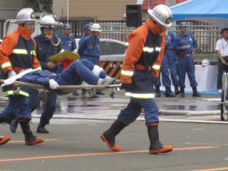 ◆「総合訓練」は、地震による災害が発生したことを想定し、消火、障害物の除去、被害者の救出を行うものです。この訓練では、技術の正確さ、活動の早さ、冷静な判断が求められます。宮の森分団は、ホースの搬送、消防車との連結、ホースの延長を手際よく行い、的を目がけて放水しました。次に障害物にローブを結束して取り除き、直ちに負傷者を救助。頭に包帯を巻き、担架に乗せて所定の場所へ搬送しました。日頃の訓練の成果がいかんなく発揮され、団員の動作はきびきびとしており、流れるように活動が進みました。